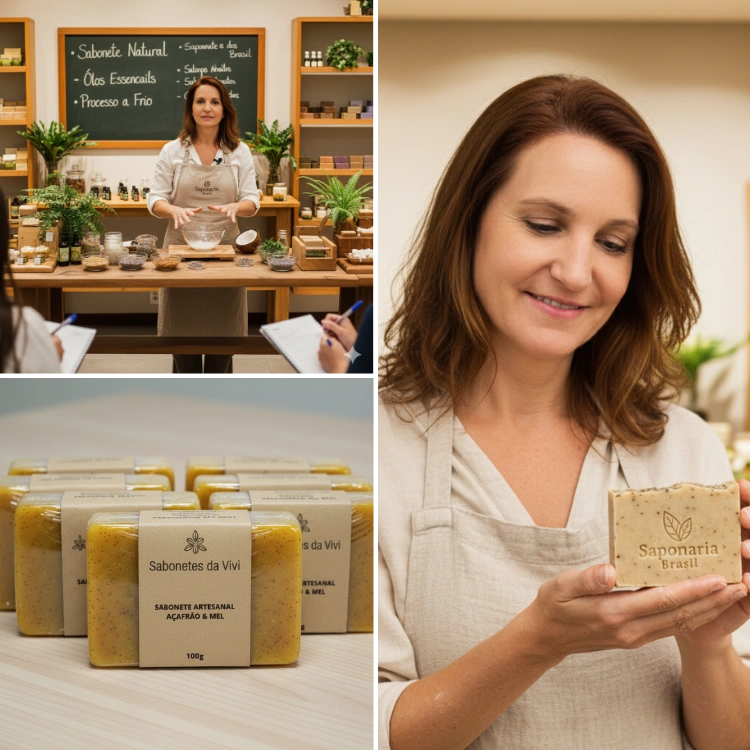 Hoje, é dona de duas lojas em shoppings famosos, referência real em saboaria glicerinada, e ensina um método direto para que outras mulheres consigam em meses o que levou quase um ano de tentativa e erro para construir.